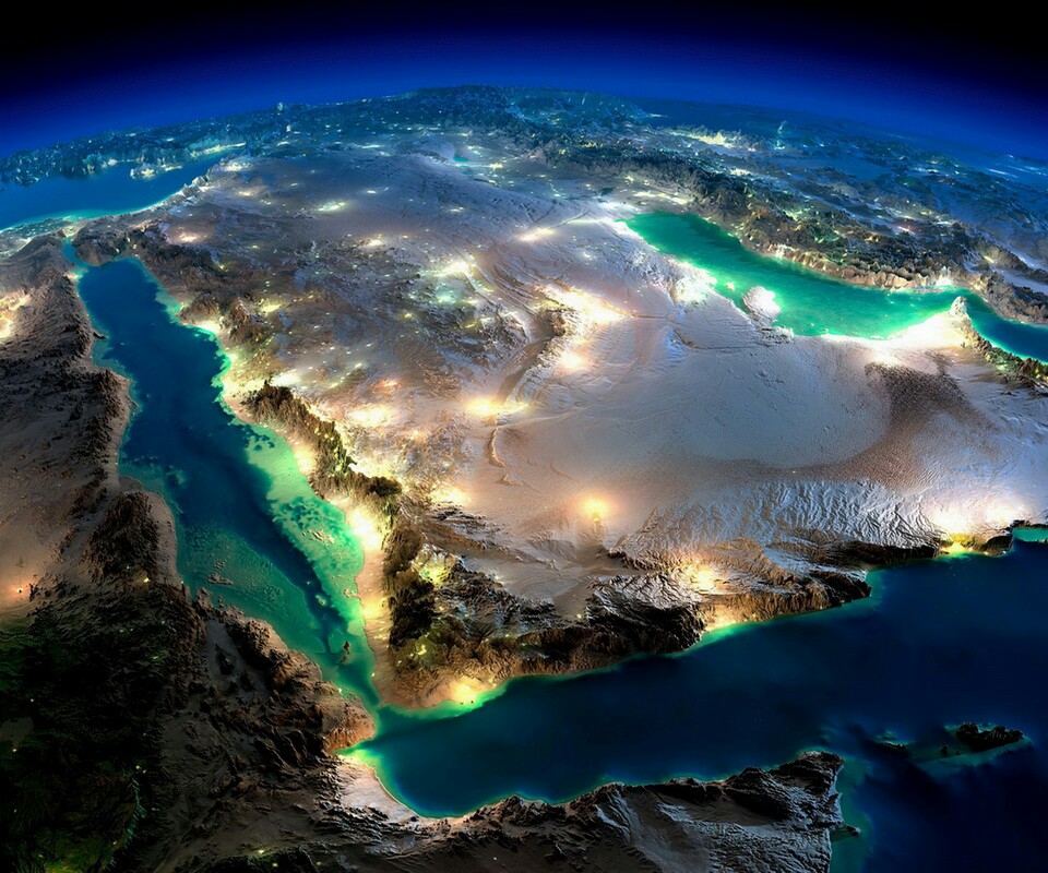 Vue nocturne de la Péninsule arabe depuis l'espace (altitudes magnifiées).